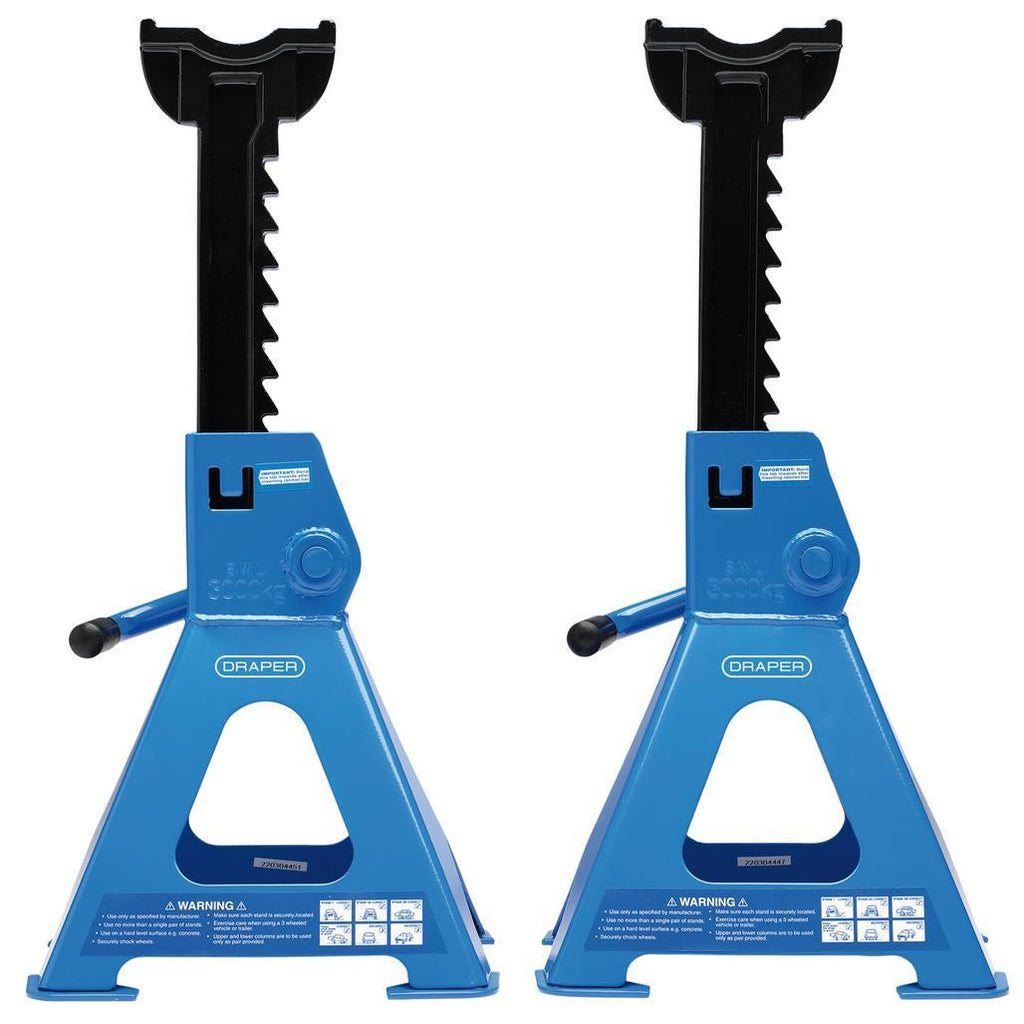 Pair of heavy duty ratcheting axle stands with 3 tonne capacity per stand for safely supporting raised vehicles.