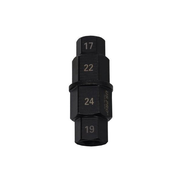 This motorcycle spindle tool is designed for front axle removal and installation on bikes with internal hex spindle sizes of 17mm, 19mm, 22mm, or 24mm.