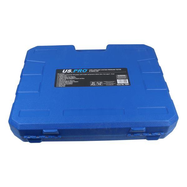 This US PRO Tools 34 piece coolant system pressure tester and refill kit is designed to help locate leaks in the coolant system by applying air pressure.